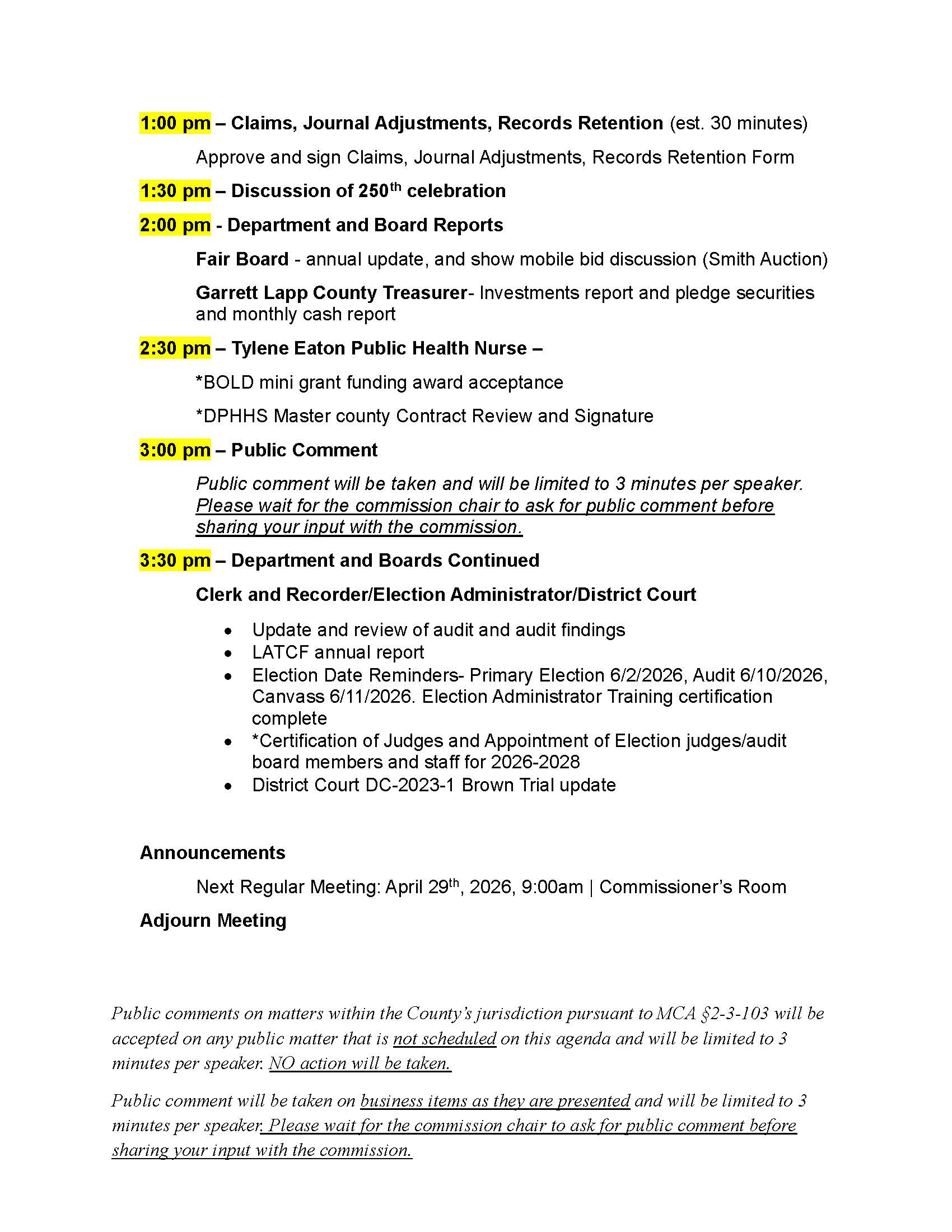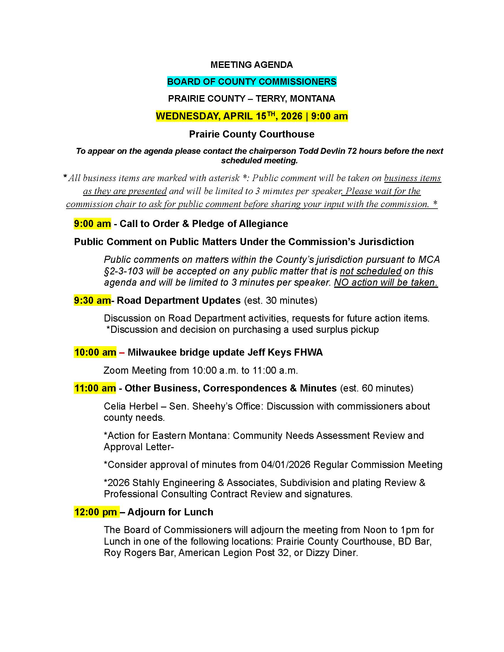 Agendas Prairie County Commissioner Agendas: APRIL 15, 2026 APRIL 1, 2026 March 18, 2026 March 11, 2026 February 27, 2026 February 11, 2026 January 28, 2025 January 21, 2025 January 7, 2025 December 30, 2025 December 17, 2025 December 10, 2025 November 26, 2025 November 25, 2025 - Working Meeting November 19, 2025 November 12, 2025 October 29, 2025 October 22, 2025 October 8, 2025 September 30, 2025 September 17, 2025 September 3, 2025 August 27, 2025 August 20, 2025 July 30, 2025 July 23, 2025 July 17, 2025 July 16, 2025 July 9, 2025 Budget Meeting Fiscal Year 2025 Commissioner Homepage