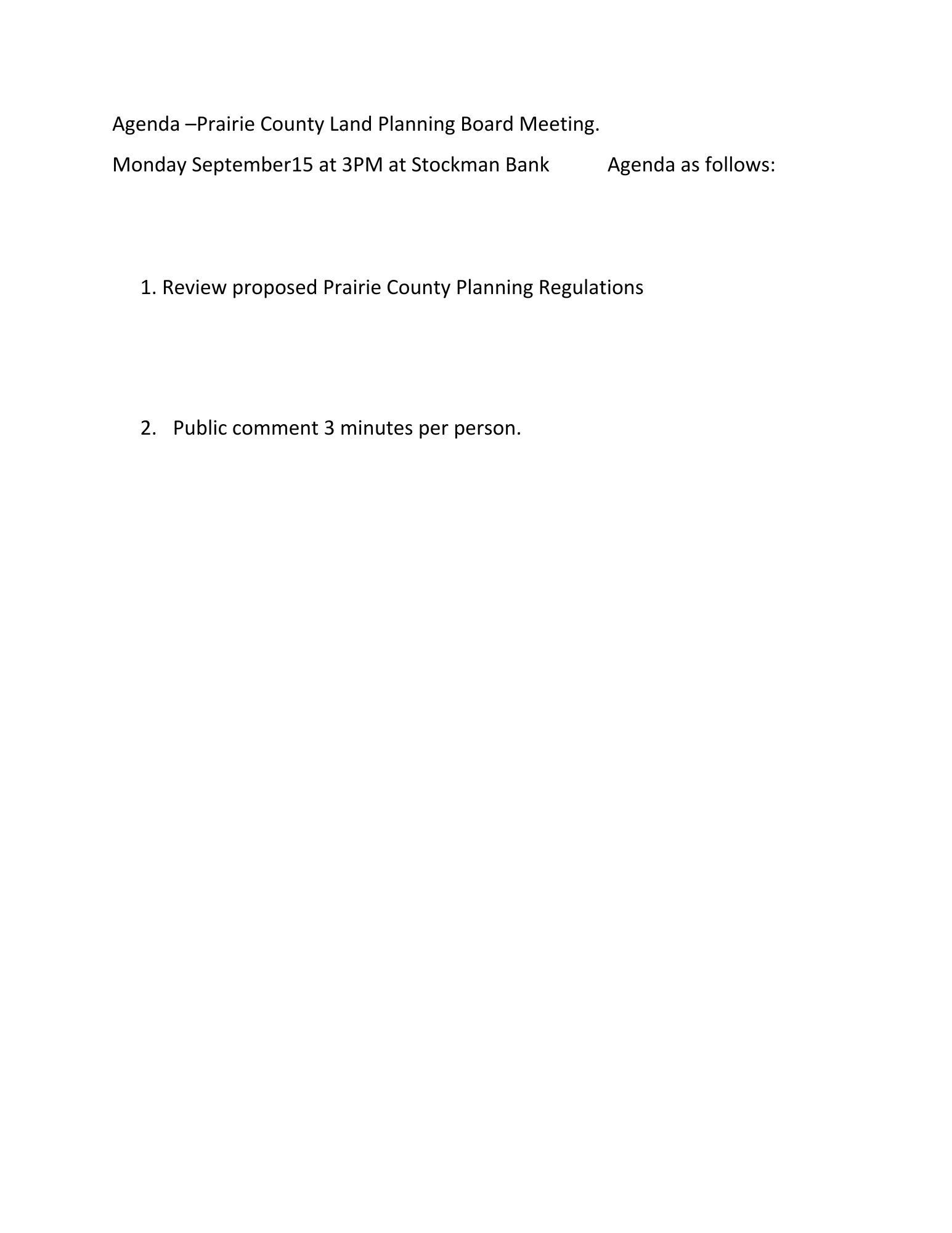Prairie County has a 5-person land planning board. Members are appointed to a 3-year term by the Board of County Commissioners. Functions of the Board include: Administration of county subdivision review Drafting of Growth Policy Growth Policy (word doc) Application for Subdivision Review (word doc) Contact for more information or to receive subdivision application packet:
